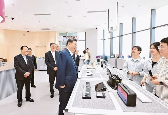 2025年4月29日,中共中央总书记、国家主席、中央军委主席习近平在上海考察。这是习近平在位于徐汇区的上海“模速空间”大模型创新生态社区人工智能产品体验店考察。 新华社记者 谢环驰/摄