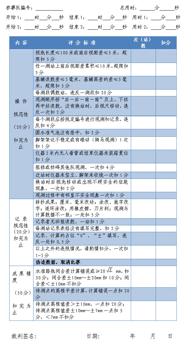 表3 2012年全国职业院校技能大赛中职组“工程测量”项目竞赛 四等水准测量评分表