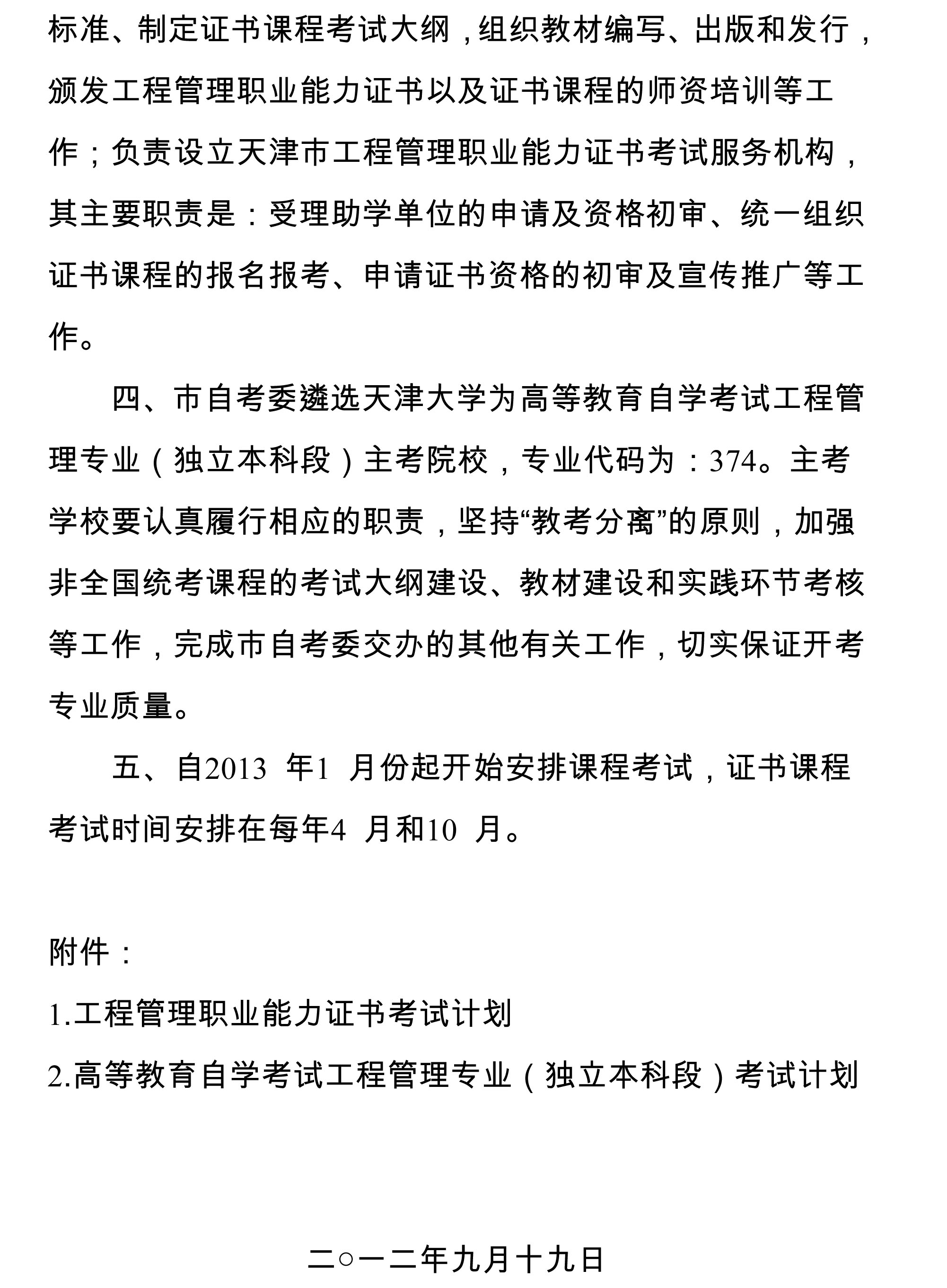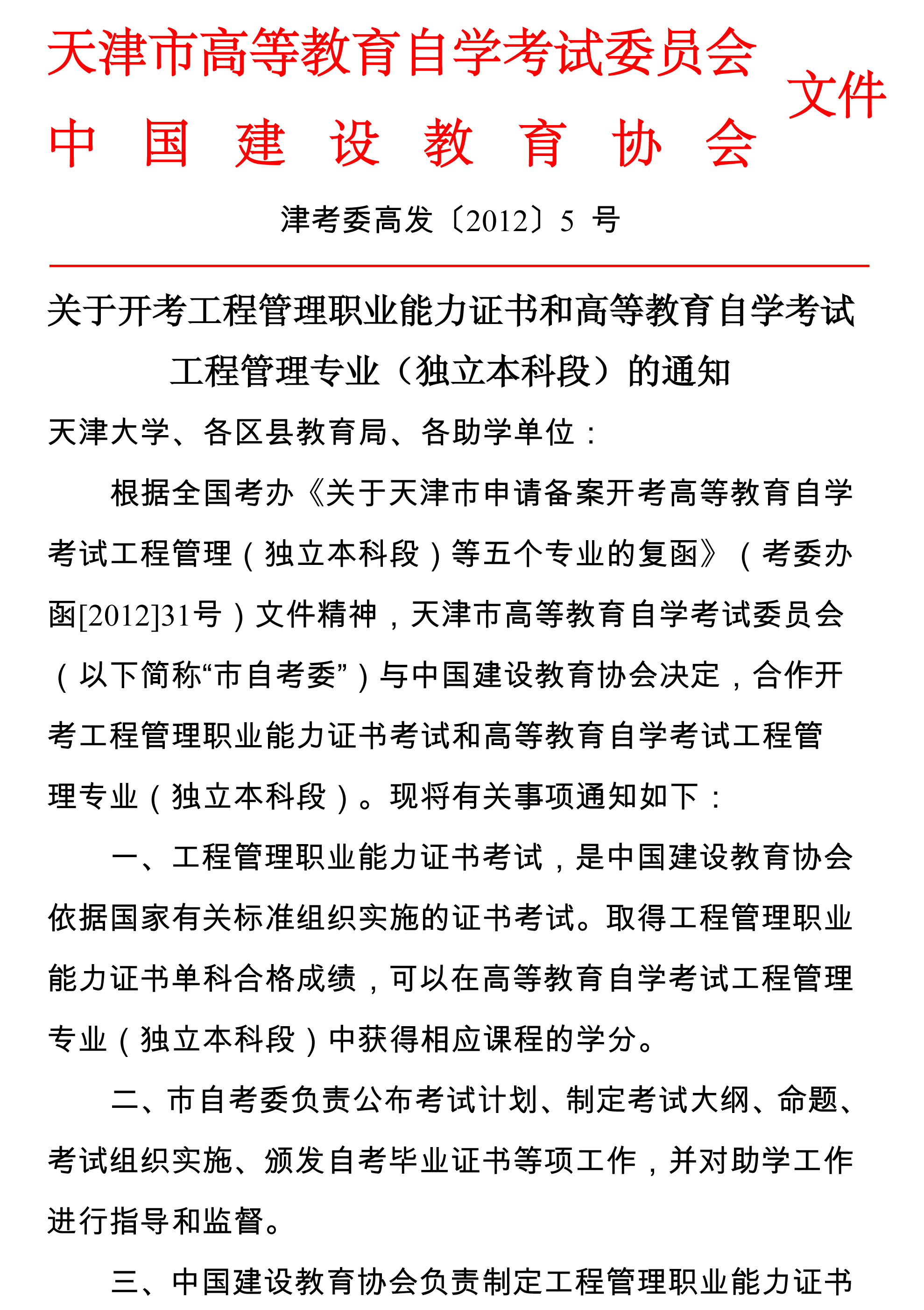 关于开考工程管理职业能力证书和高等教育自学考试工程管理专业(独立本科段)的通知