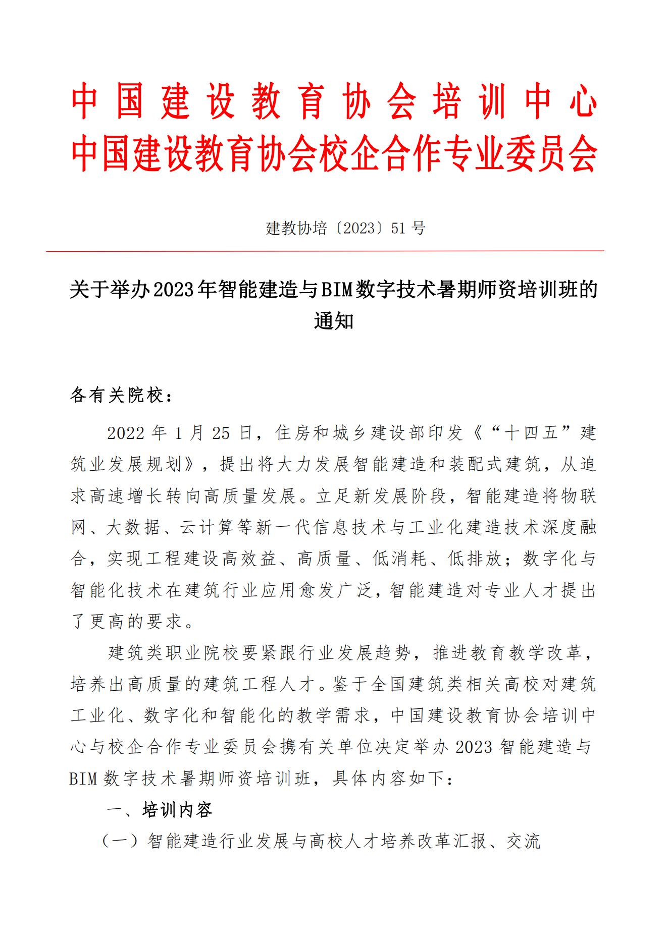 建教协培〔2023〕51号关于举办2023年智能建造与BIM数字技术暑期师资培训班的通知