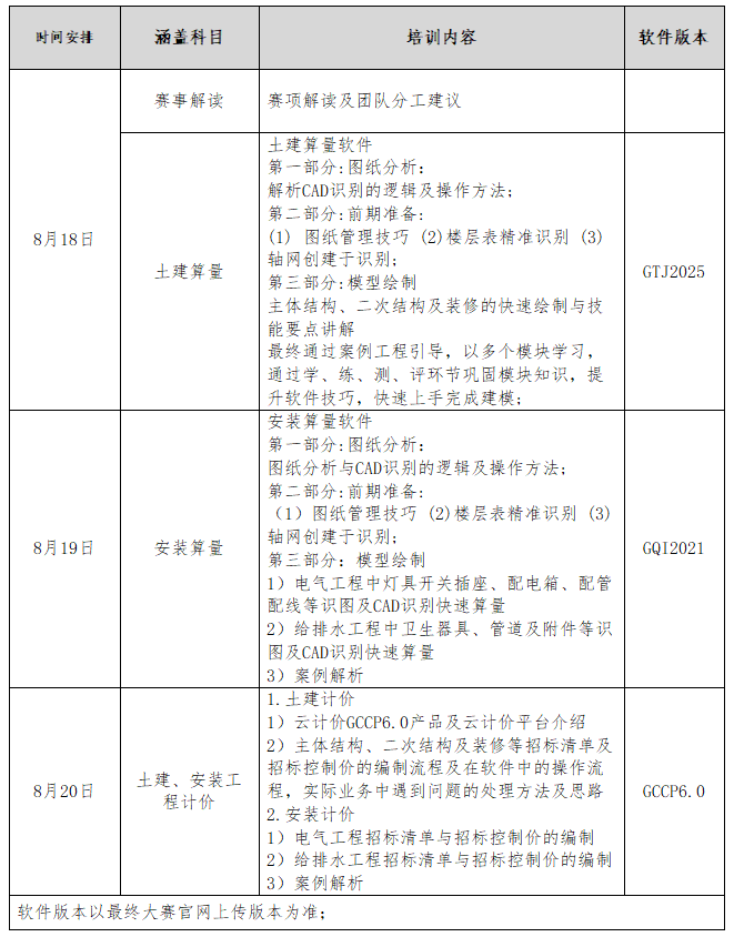 为深入贯彻落实“十四五”规划关于建筑业数字化转型升级的战略部署,加快培育适应行业发展的复合型人才,深化产教融合与教育教学改革,全面提升全国建筑类院校师生数字建筑创新应用能力及备赛水平,助力2025年全国数字建筑创新应用大赛高质量开展,beat365官网培训中心定于2025年8月18日-8月20日举办“2025年全国数字建筑创新应用大赛选拔赛赛前能力强化训练营”。现将有关事项通知如下: