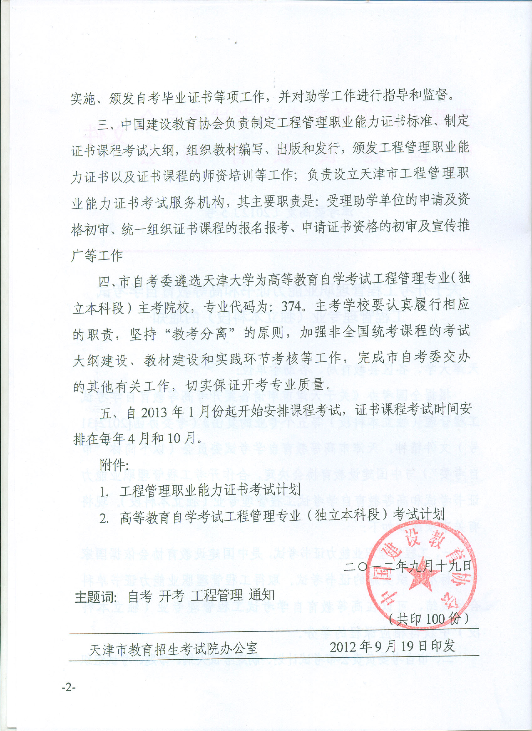 津考委高发[2012]5号 关于开考工程管理职业能力证书和高等教育自学考试工程管理专业(独立本科段)的通知