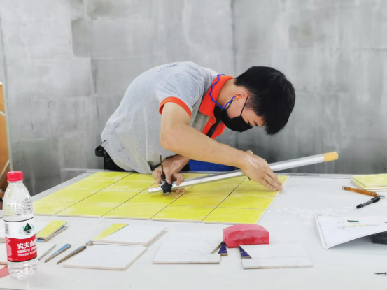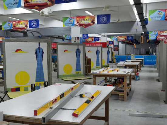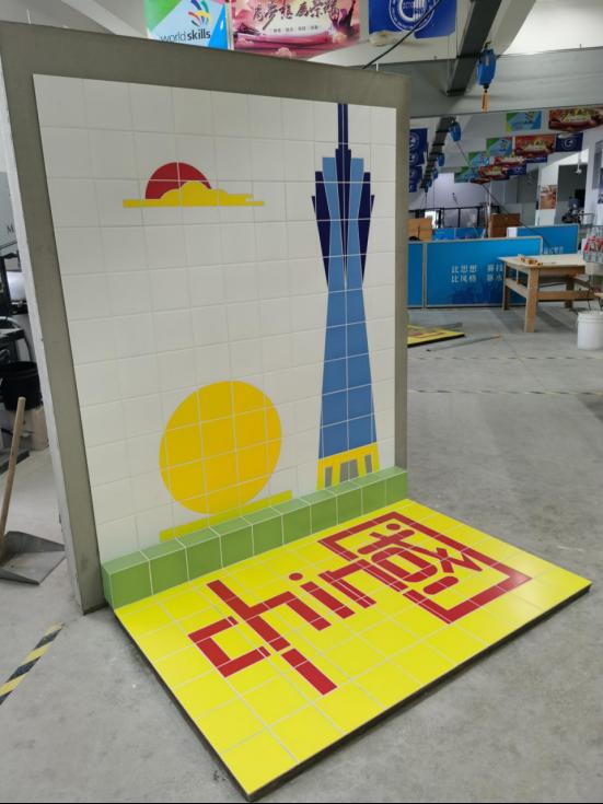 在11个小时的比赛中,选手需要按照要求用瓷砖贴完墙面、地面,十名行业专家从平整、尺寸、水平等各精度方面进行评测,评分标准接轨世界技能大赛。