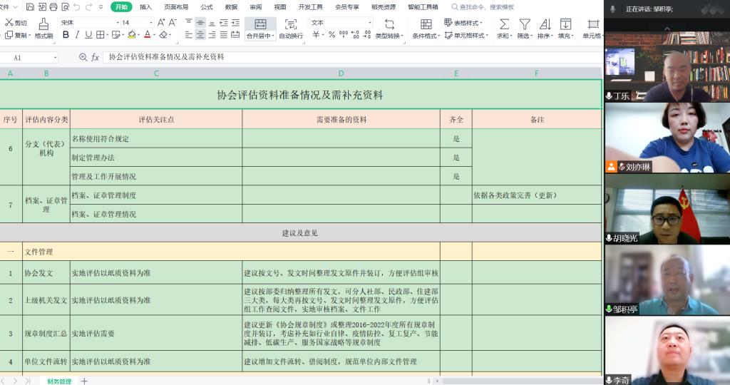 5月25日—6月2日每天上午,办公室全体人员围绕协会近期重点工作——社团评估开展研讨,分解任务清单,理清工作思路,做到各项工作有分工,具体工作有落实。李奇助理理事长每天全程参加会议,对各项工作进行布置指导。办公室还特别邀请胡晓光助理理事长讲解如何准备社团评估资料及重点要求。
