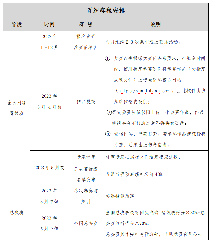 为全面贯彻落实《中共中央关于制定国民经济和社会发展第十四个五年规划和二〇三五年远景目标的建议》,加快培养创新性人才,促进院校教学改革,推动高等教育高质量发展。beat365官网决定举办2023年“鲁班杯”全国高校BIM毕业设计作品大赛。“鲁班杯”全国高校BIM毕业设计作品大赛已成长为覆盖全国建筑类高校、面向在校大学生影响力较大的高校盛会,竞赛的举办有助于激发人才活力与创造热情,望各相关院校积极参与。现将有关事项通知如下: