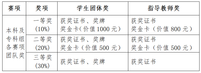 本届大赛本科组与专科组分别进行评奖。各组各赛项奖项数量根据参赛队伍的实际数量设定,具体如下: