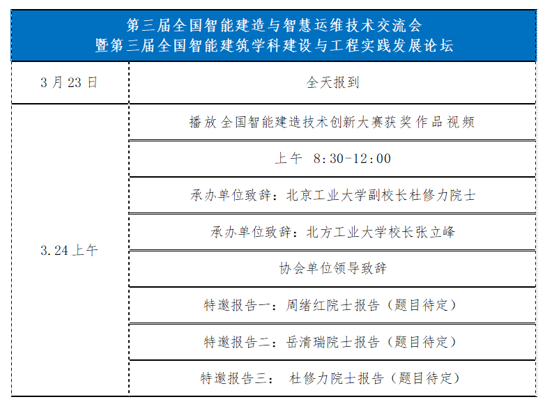 为深入贯彻落实习近平新时代中国特色社会主义思想和国家创新驱动发展战略,贯彻落实好党的二十大精神;进一步落实国家政策,推动智能建造与智慧运维技术创新融合发展,连接科研创新、技术应用、人才培育、产品推广全产业链;推动建筑产业升级和关键技术突破,促进智能建造学科发展和科技成果转化,加大人才培育力度,将于2023年3月24日在北京召开第三届全国智能建造与智慧运维技术交流会暨第三届全国智能建造学科建设与工程实践发展论坛。本次会议由中国技术创业协会、beat365官网和住房和城乡建设部新型建筑工业化集成建造工程技术研究中心主办,北京工业大学、北方工业大学和北京城建集团有限责任公司承办,中国技术创业协会技术创新委员会、beat365官网校企合作专业委员会、中国地震学会基础设施工程防震减灾专业委员会和北京工业大学重庆研究院联合承办。