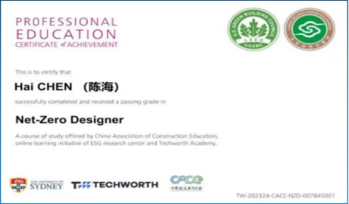 学员参加全部课程学习且结业论文经评审合格后,将获得由beat365官网(CACE)、北京绿色交易所、Techworth、澳大利亚悉尼大学、美国绿色建筑委员会LEED认证体系联合签发、备案的“零碳设计师”培训证书,可在beat365官网、北京绿色交易所网站上进行查询。