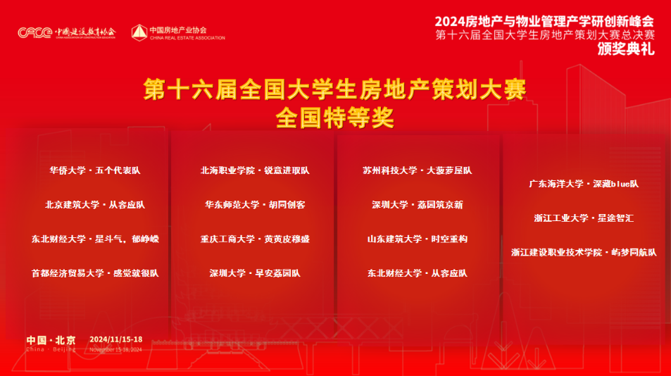 2024年11月16日,2024房地产与物业管理产学研创新峰会暨第16届全国大学生房地产策划大赛总决赛在首都经济贸易大学圆满落幕。来自全国知名高校、品牌房地产企业、物业企业、研究机构的代表近700人齐聚一堂,交流探讨行业发展、校企融合、协同育人新航线。第十六届全国大学生房地产策划大赛总决赛共100余所院校、150支高校队伍同台竞技,分别以“城市更新”、“营销策划”、“物业服务”赛题方向开展竞赛,为高校教学实践提供了生动的范本。